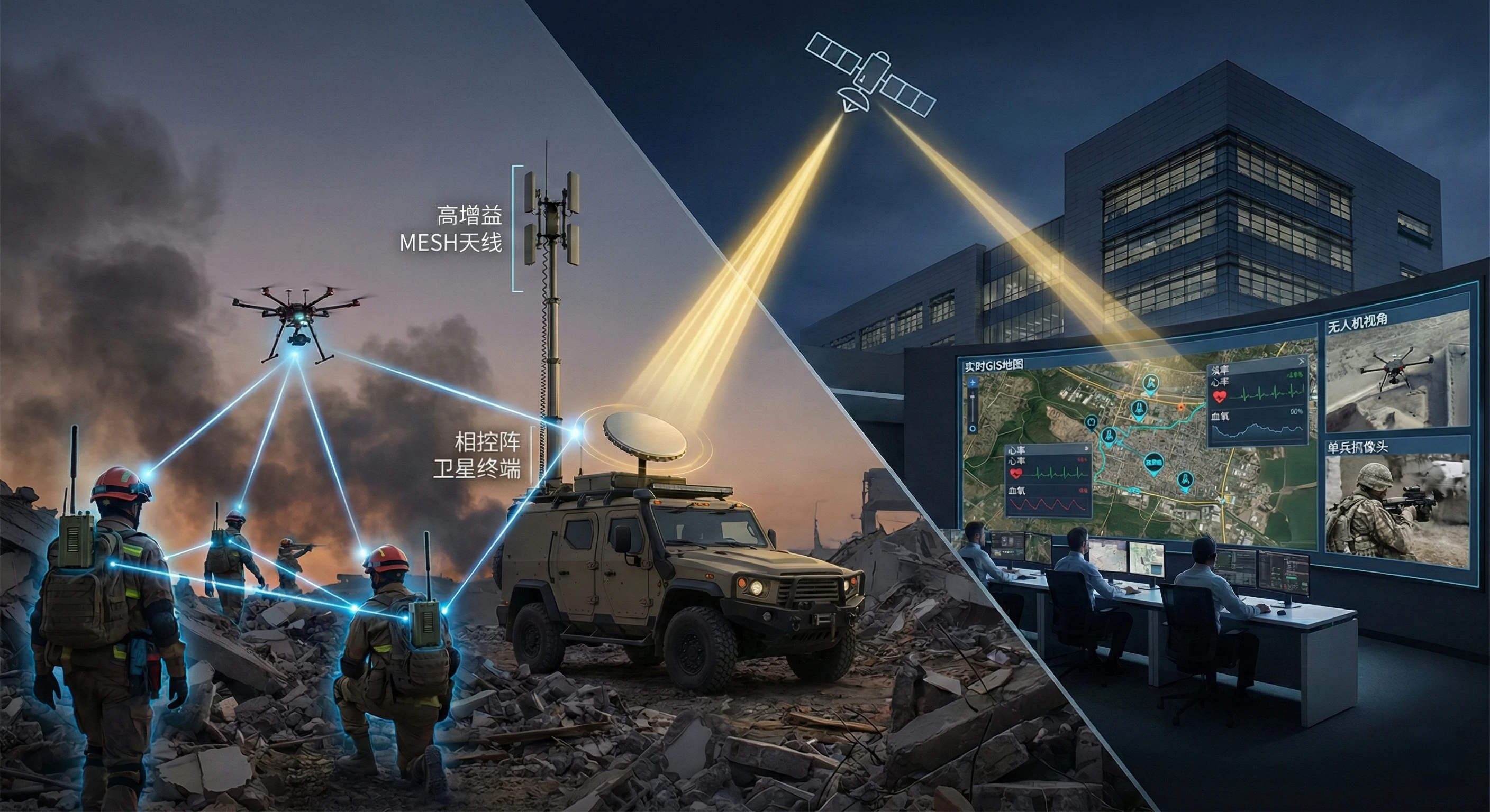 救援人员佩戴SDR自组网手持/背负单兵,无人机搭载机载宽带模块作为中继节点。指挥车部署高功率MESH基站覆盖整个救援现场(半径5-10km),汇聚所有单兵数据。车顶的相控阵卫星终端即使在车辆移动中也能锁定卫星,建立通往互联网的大带宽链路。后方指挥中心通过卫星链路接收数据,在GIS地图上实时查看单兵位置、生命体征及无人机回传的高清视频。