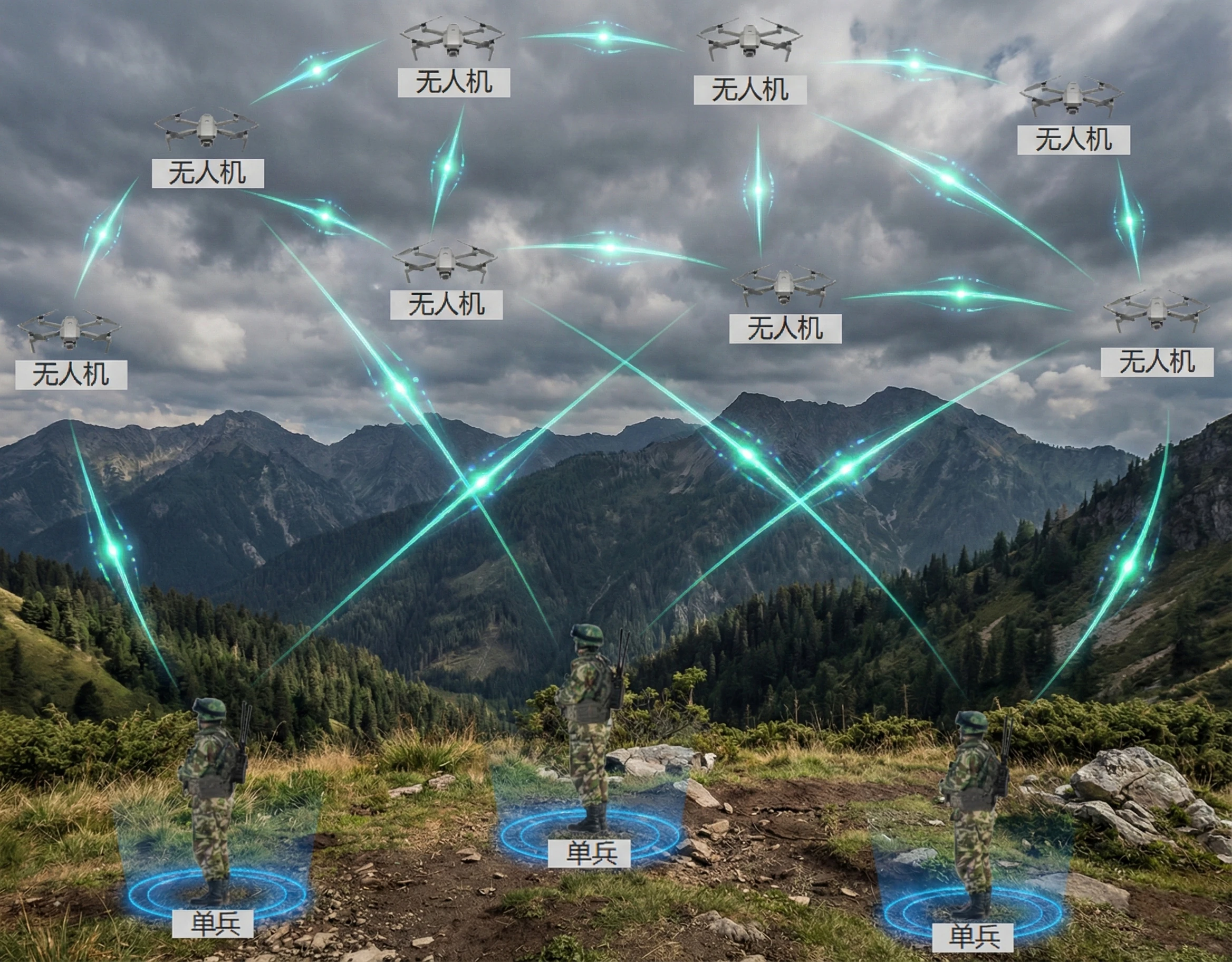 针对大规模无人机协同作战、表演或巡检,采用窄带集群自组网模块,支持高达256个节点的大规模组网,具备低延时、高抗毁性特点。